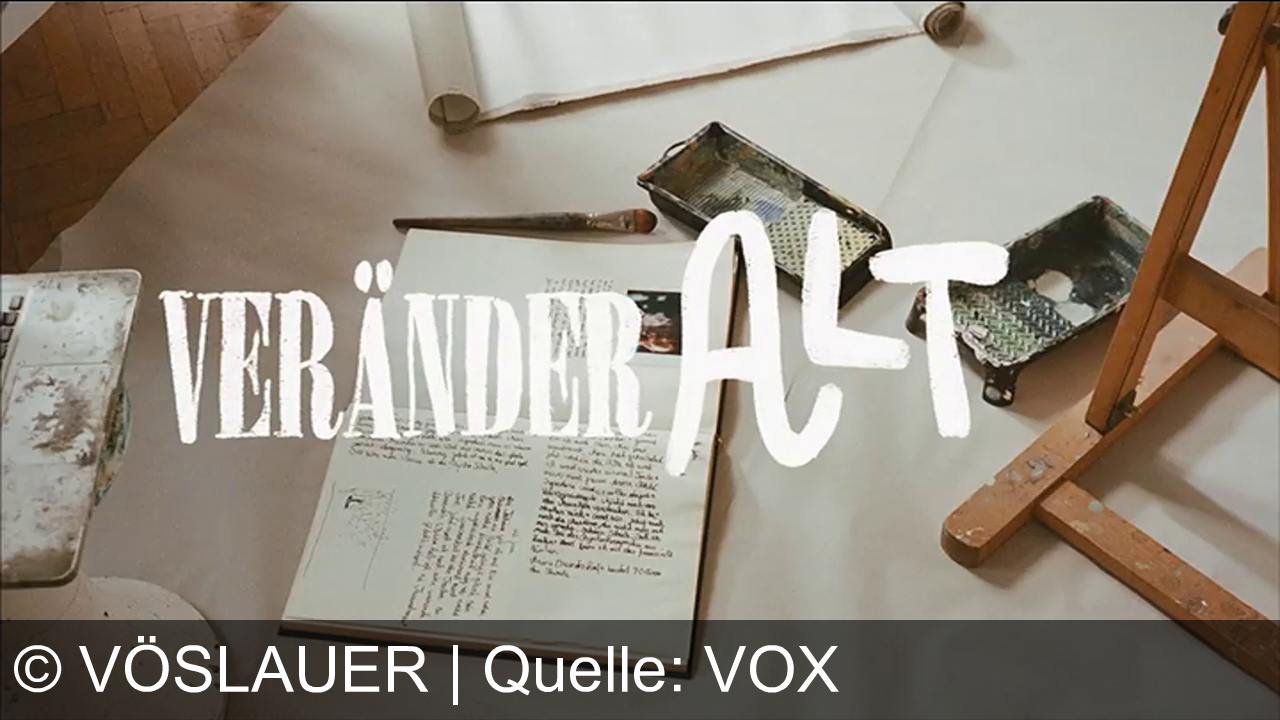 Auf dem Tisch liegen ein offenes Notizbuch mit handgeschriebenen Texten, ein Pinsel, Farbpaletten und ein Holzstaffelei‑Fuß. Groß steht der Schriftzug VERÄNDER ALT über der Szene.