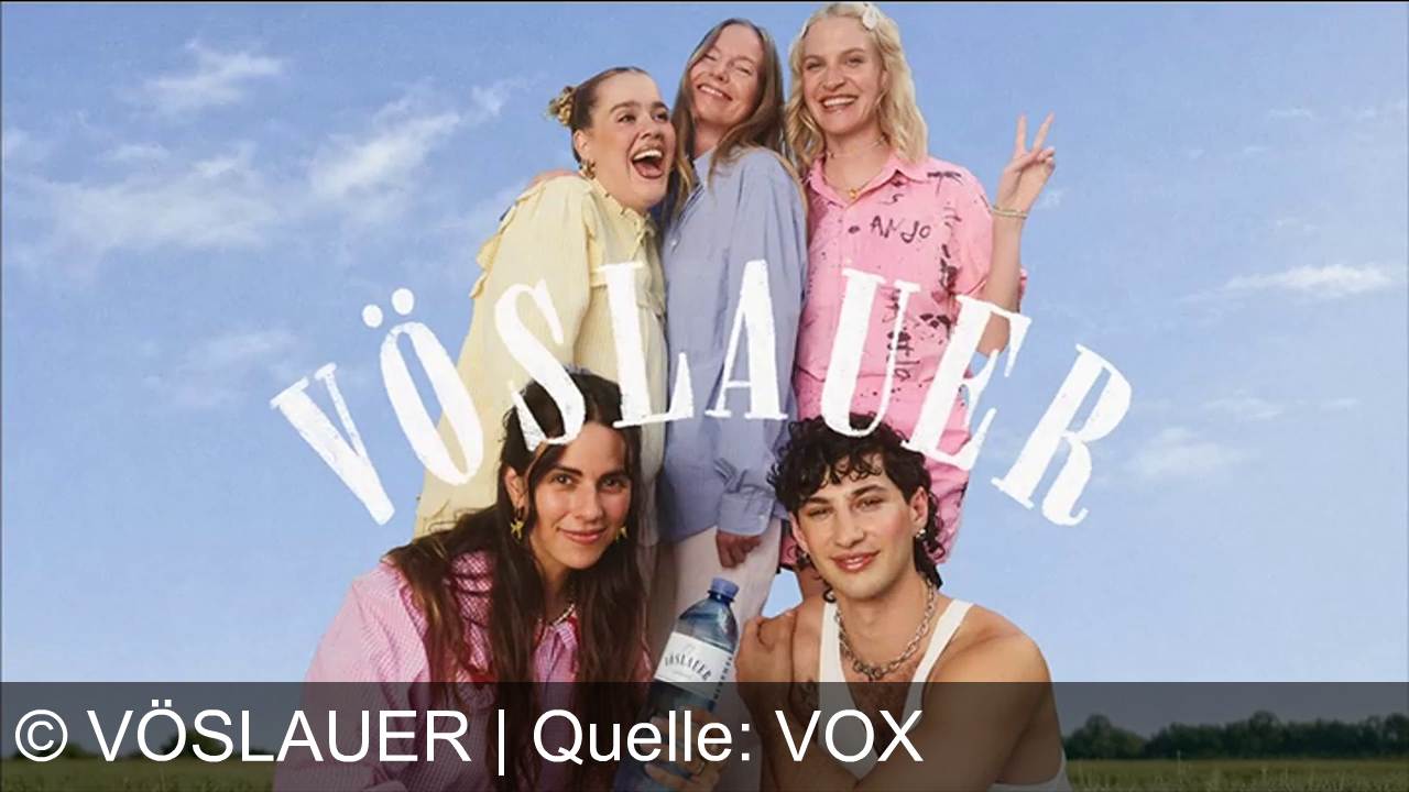 Fünf junge Leute stehen locker zusammen auf einer Wiese, lachen in die Kamera und posieren gut gelaunt. Zwei sitzen vorne, eine hält eine Wasserflasche hoch. Der Himmel ist blau und der Schriftzug Vöslauer steht groß davor.