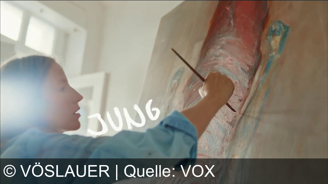 Eine Frau steht vor einer großen Leinwand und malt mit einem Pinsel rote und blaue Farben auf das Bild. Sie trägt ein helles Jeanshemd, und neben ihr steht das Wort JUNG in weißer Schrift. Sonnenlicht fällt von links ins Zimmer.