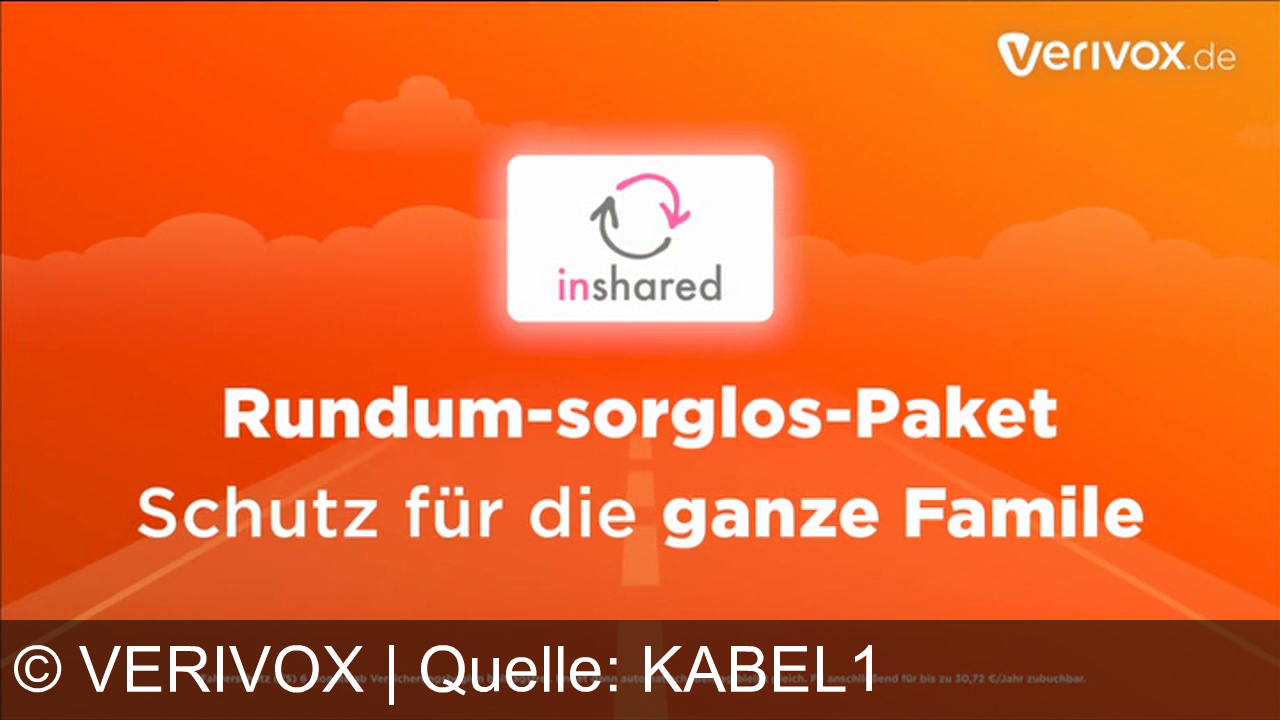 Ein orangefarbener Hintergrund mit Wolken. In der Mitte das Inshared-Logo. Text: "Rundum-sorglos-Paket. Schutz für die ganze Familie." Oben rechts "Verivox.de". Unten ein kleiner Text mit Versicherungsbedingungen.