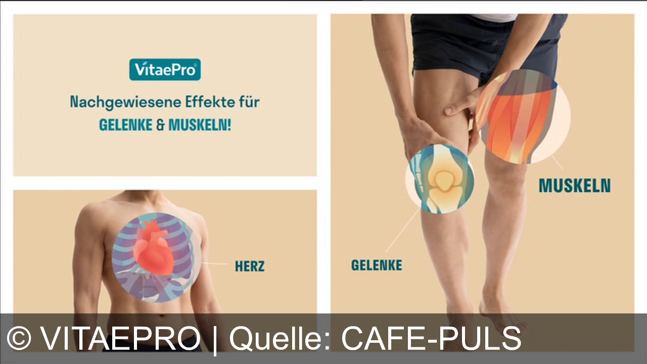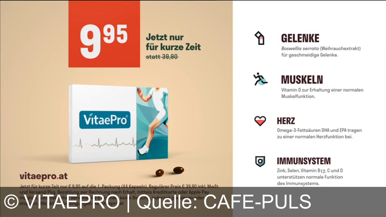 VitaePro bewirbt ein Nahrungsergänzungsmittel mit nachgewiesenen Effekten für Gelenke, Muskeln, Herz und Immunsystem. Inhaltsstoffe wie Boswellia, Omega‑3 und Vitamin D sollen ein aktiveres Leben unterstützen. Der Spot betont Wirksamkeit und bietet eine zeitlich begrenzte Testpackung für 9,95 € auf vitaepro.at an.