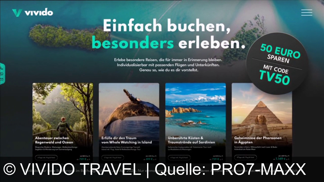 Vivido Travel Werbung aus dem Jahr 2026 in Österreich, mit dem von uns gewählten Titel: "Vivido Travel: Individuelle Erlebnisreisen einfach buchen & 50€ mit Code TV50 sparen" mit der Kurzbeschreibung: "Einfach mit Vivido buchen und besonders erleben: Spare 50 Euro auf deine Erlebnisreise mit Code TV50.". Diese Werbung thematisiert oder beinhaltet die Kategorie/n Urlaub Reisen, Hotel, Rabatt