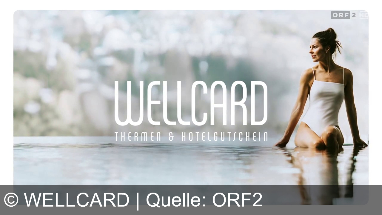 Eine Frau trägt einen weißen Badeanzug und sitzt am Rand eines Pools. Rechts oben das ORF 2 HD Logo. In der Mitte steht der Text "WELLCARD Thermen & Hotelgutschein." Der Hintergrund ist unscharf und vermittelt eine ruhige Atmosphäre.
