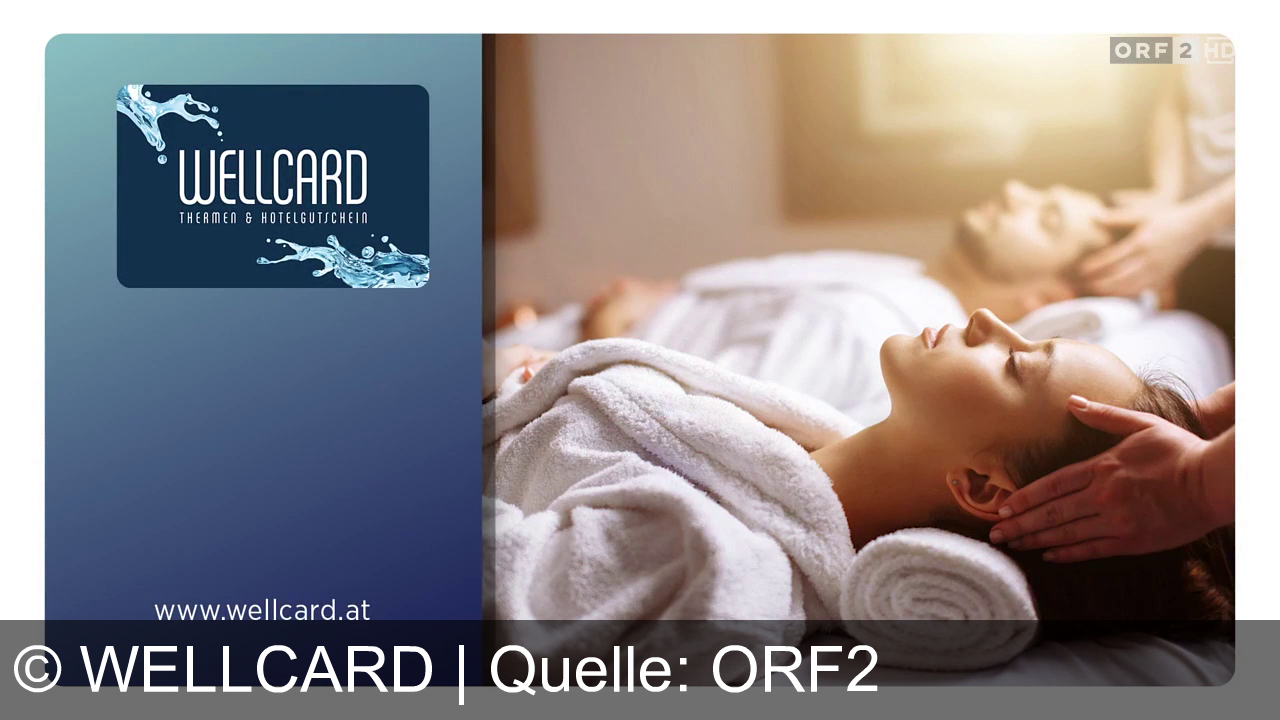 Links ein Wellcard-Logo mit Wasser-Design. Rechts eine entspannte Frau in einem weißen Bademantel, Kopf auf ein Handtuch gebettet, wird massiert. Dahinter ein Mann, der ebenfalls massiert wird. Oben rechts das ORF2 HD-Logo. Unten die Webseite: www.wellcard.at.
