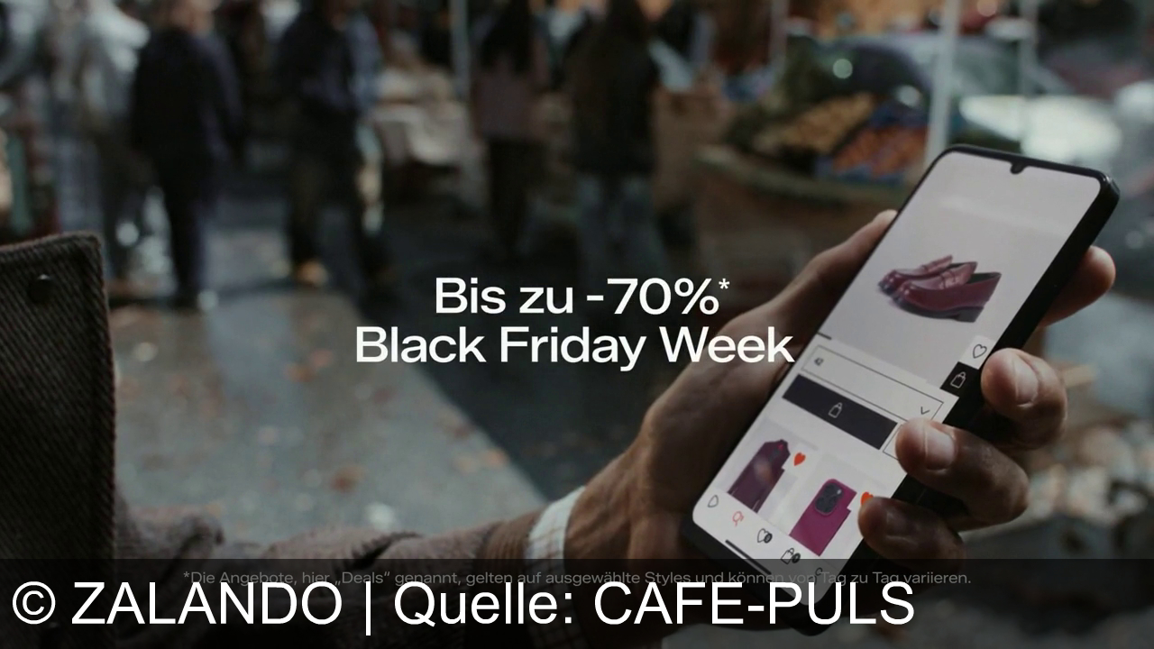 Zalando bewirbt in seinem TV-Spot die Black Friday Week mit bis zu 70 % Rabatt auf Mode wie Mäntel, Krawatten und Schuhe. Die App ermöglicht einfaches Shopping aktueller Styles – jetzt downloaden und reduzierte Angebote entdecken. Werbeaussage: Modevielfalt, günstige Deals, bequem per App.