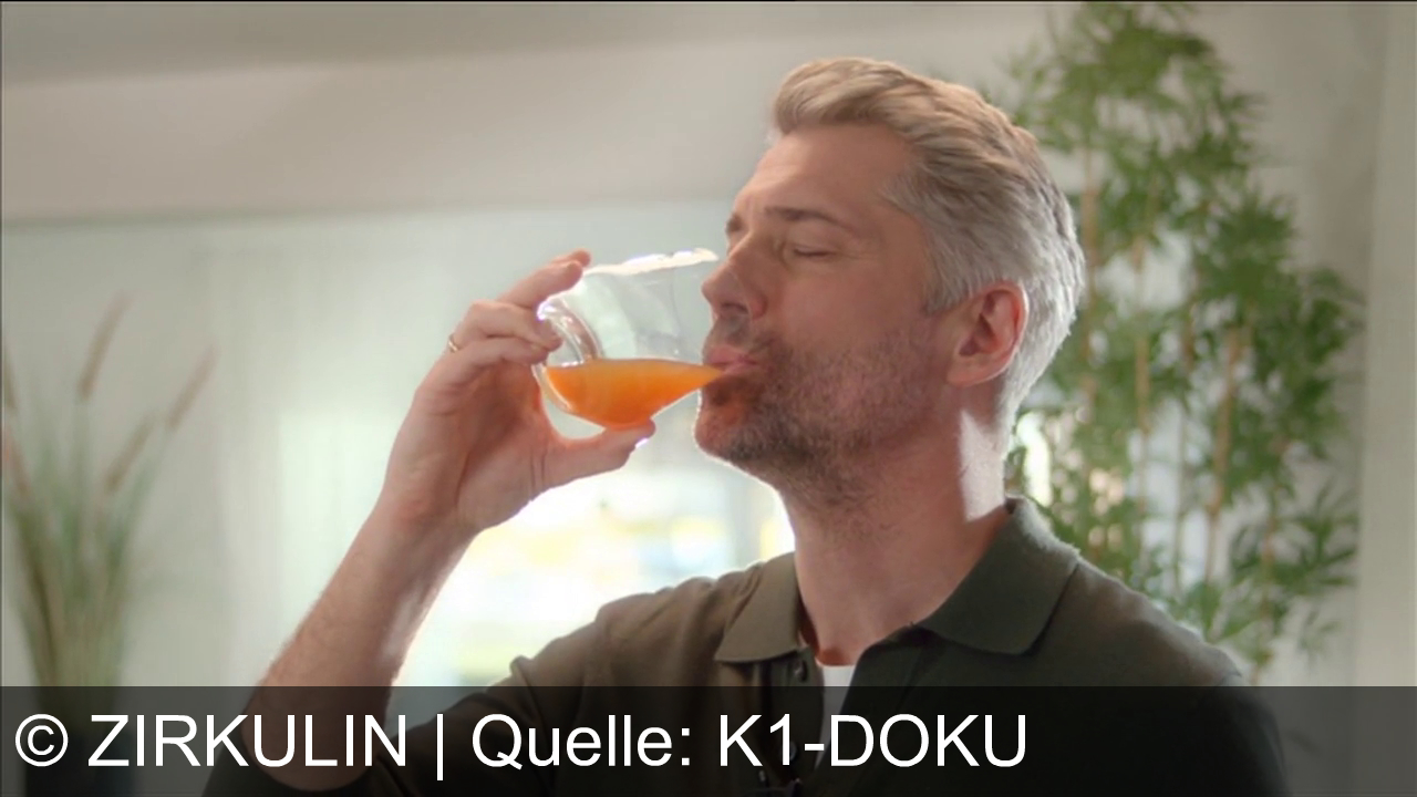 Ein Mann mit grauem Haar und grünem Hemd trinkt aus einem Glas mit orangener Flüssigkeit. Im Hintergrund steht eine Pflanze.