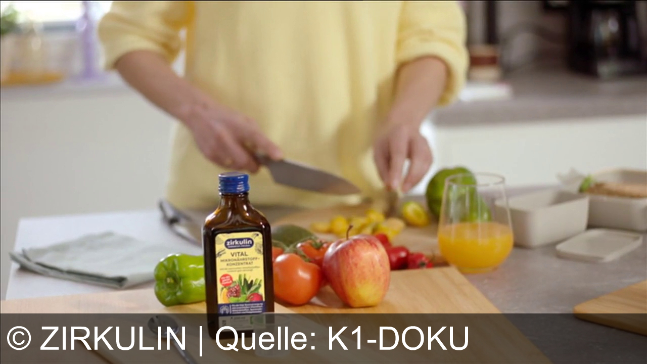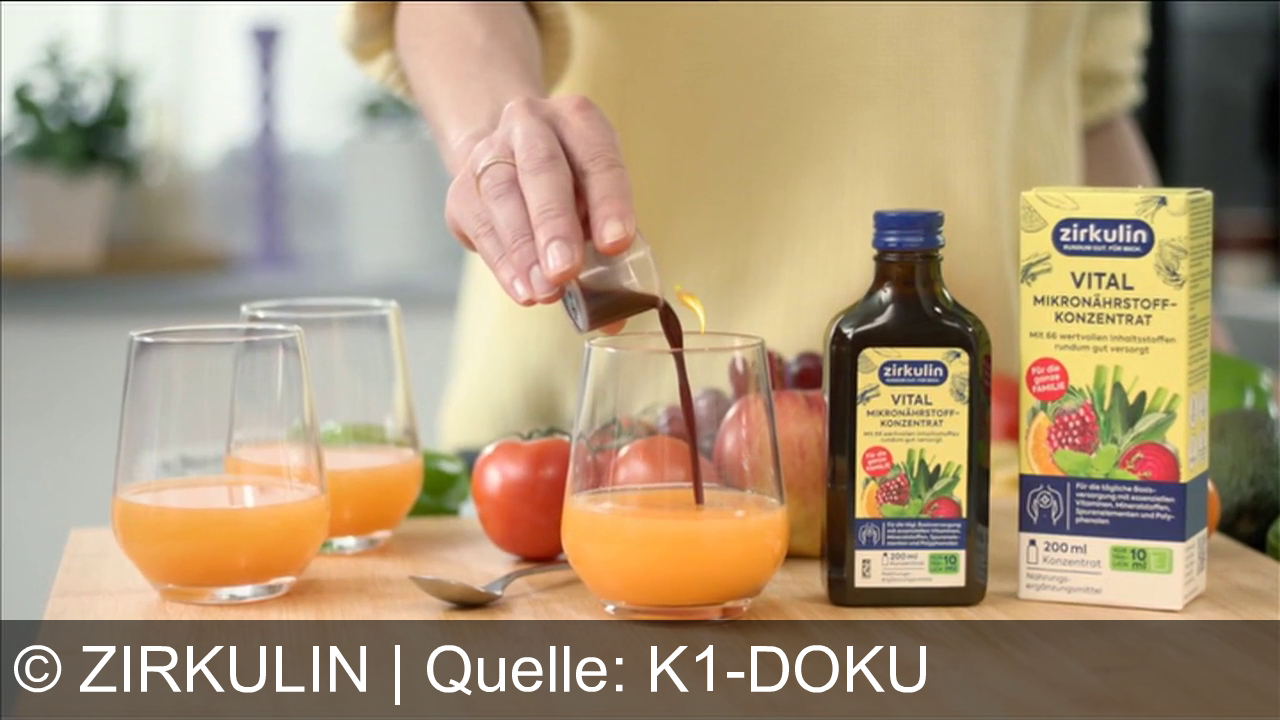 Zirkulin Vital Mikronährstoffkonzentrat versorgt täglich mit 66 wertvollen Zutaten aus Obst, Gemüse und Kräutern. Nur 10 ml reichen für die umfassende Unterstützung des Körpers. Die Werbebotschaft: Einfach rundum gut versorgt – jetzt erhältlich bei dm, Rossmann und Budni.