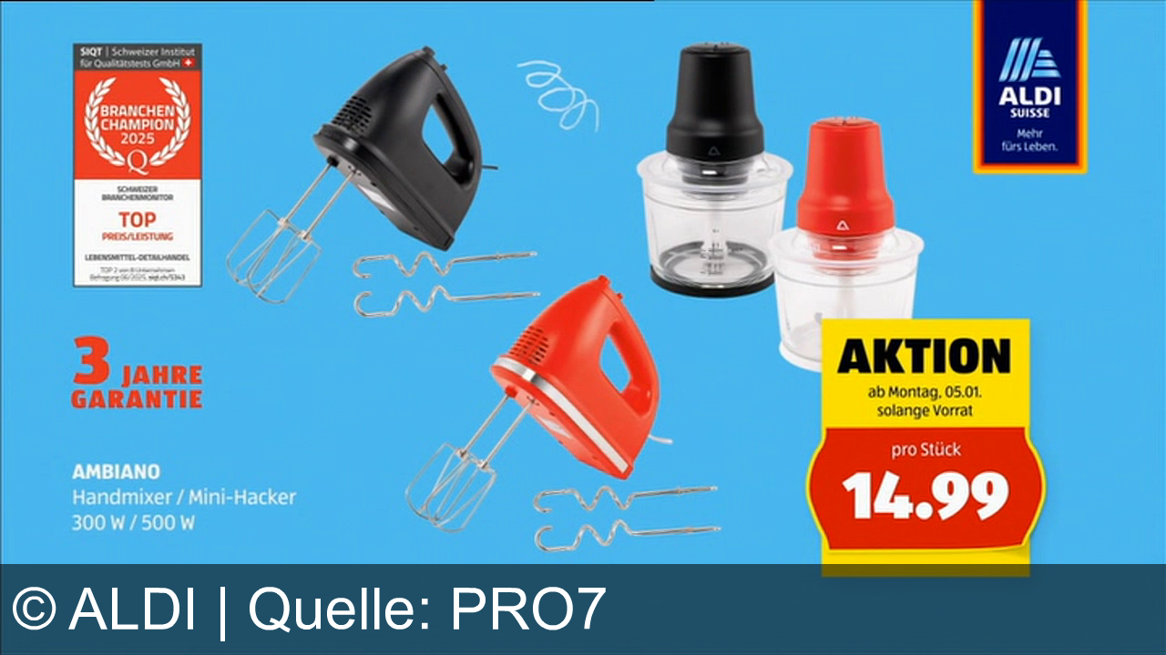 Blaue Hintergrund, zwei Handmixer in Schwarz und Rot, Mini-Hacker in Schwarz und Rot. "3 Jahre Garantie" steht dort. Preis: 14.99. Aktion ab Montag, 05.01., solange Vorrat reicht. Oben rechts Aldi Suisse Logo. "Branchen Champion 2025" Siegel ist links zu sehen. Ambiano, 300W/500W steht neben den Geräten.