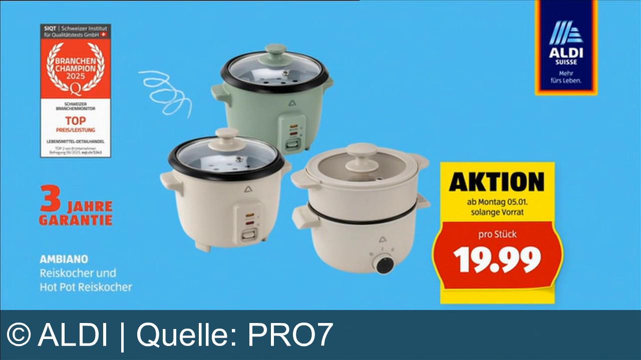 Drei Reiskocher in verschiedenen Farben auf blauem Hintergrund. Links ein Siegel mit „Branchen Champion 2025“. Text: „3 Jahre Garantie, Ambiano Reiskocher und Hot Pot Reiskocher“. Rechts ein ALDI Suisse Logo und ein gelbes Schild mit der Aufschrift „Aktion“ und dem Preis 19.99, gültig ab Montag, solange Vorrat.