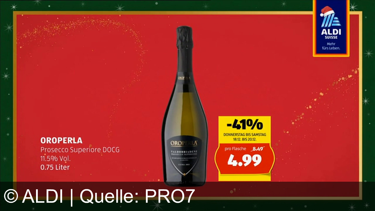 Eine Flasche OROPERLA Prosecco Superiore DOCG auf rotem Hintergrund. 11,5% Vol., 0,75 Liter. Preisreduktion um 41% auf 4,99 Euro, gilt von Donnerstag bis Samstag, 18.12. bis 20.12. Ursprünglicher Preis 8,49 Euro. Oben rechts das Aldi Suisse Logo mit Weihnachtsmütze, Slogan "Mehr fürs Leben". Grüner Rahmen mit goldenen und weißen Sternen.