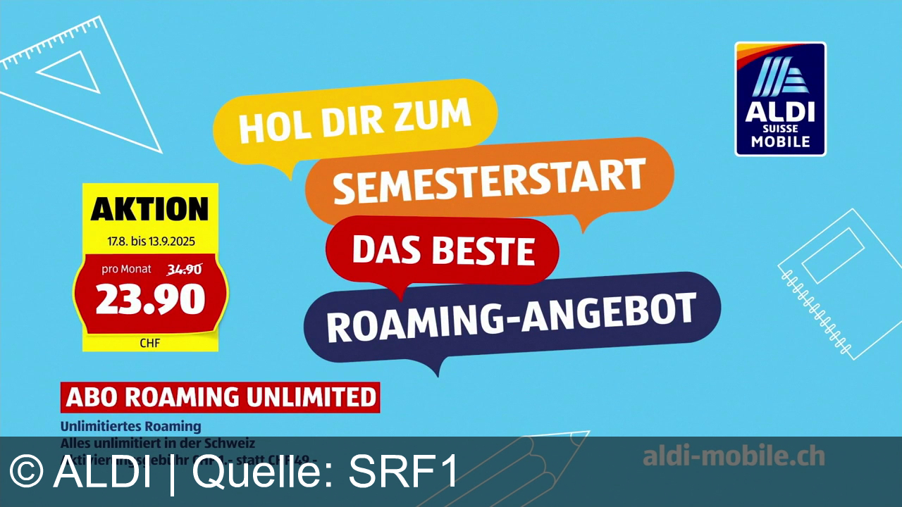 Aldi Suisse Mobile bewirbt ein Roaming-Angebot. Bunte Sprechblasen mit "Hol dir zum Semesterstart das beste Roaming-Angebot". Aktionspreis: 23,90 CHF monatlich statt 34,90 CHF. Gültigkeit: 17.8. bis 13.9.2025. Unlimitiertes Roaming in der Schweiz, Aktivierungsgebühr 1 CHF statt 49 CHF. Hintergrund mit Geometrie-Dreieck und Notizbuch. Webseite: aldi-mobile.ch.