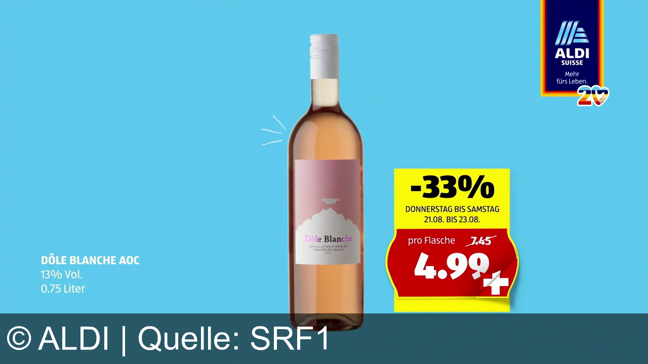 Eine Weinflasche mit dem Etikett "Dôle Blanche AOC 13% Vol. 0,75 Liter". Daneben ein gelbes Schild mit der Aufschrift "-33% Donnerstag bis Samstag 21.08. bis 23.08. pro Flasche 4.99 CHF". Oben rechts das Aldi Suisse Logo mit "Mehr fürs Leben". Hintergrund in Hellblau.