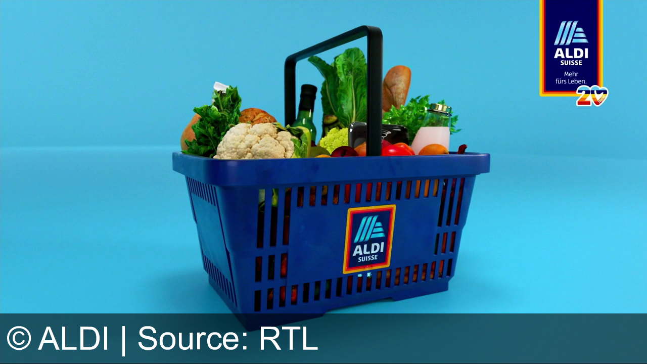 Ein blauer Einkaufskorb mit dem ALDI SUISSE Logo, gefüllt mit verschiedenen Lebensmitteln wie Gemüse, Brot und einer Flasche. Der Hintergrund ist hellblau. Oben rechts steht „Mehr fürs Leben“ und eine „20“.
