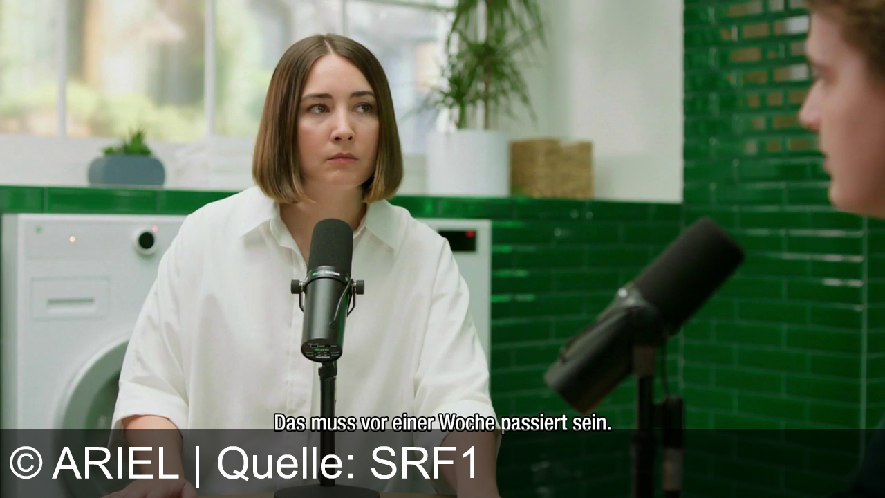 Eine Frau sitzt vor einem Mikro und schaut ernst nach vorn. Neben ihr steht eine Waschmaschine, im Hintergrund hängen grüne Fliesen und ein paar Pflanzen. Ein zweites Mikro steht rechts im Bild, vor einer weiteren Person. Untertitel laufen mit.