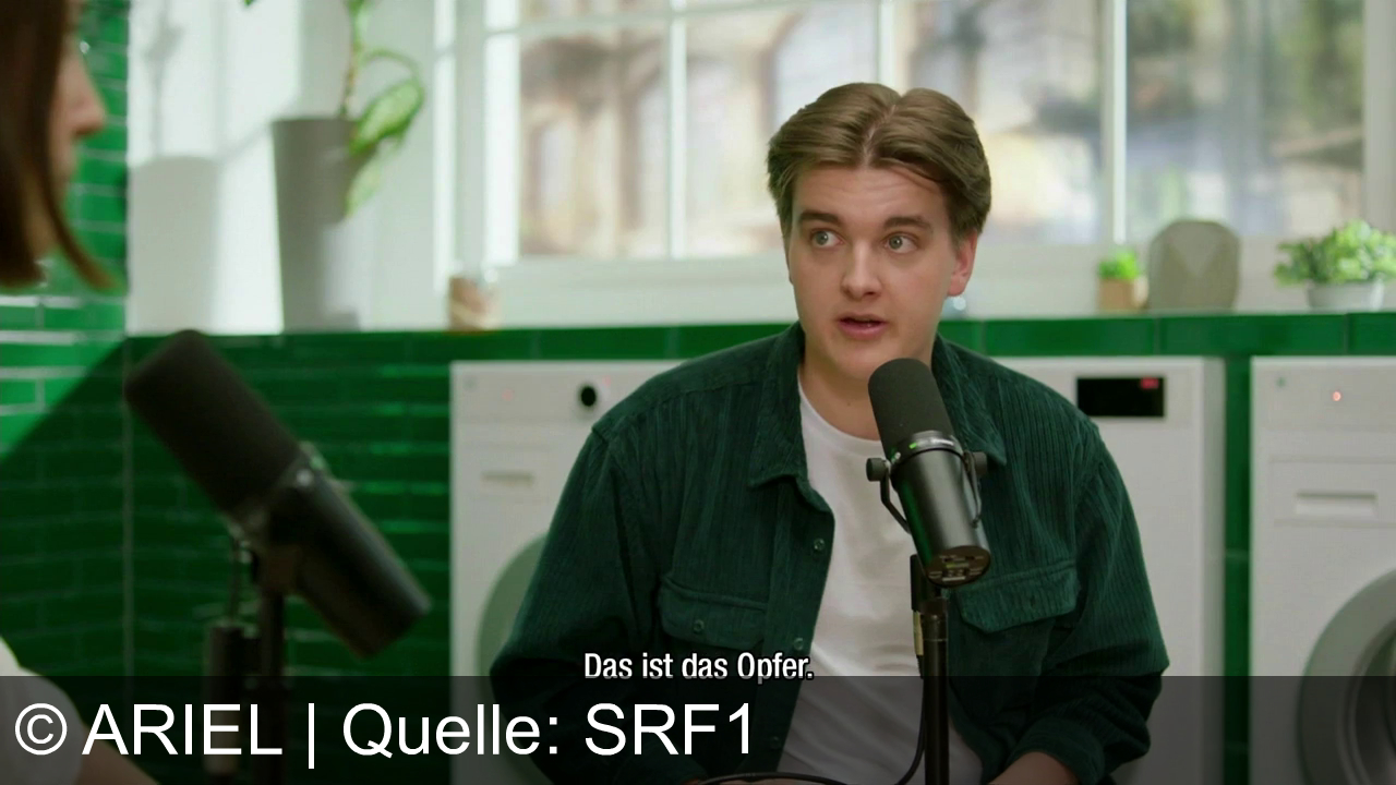 Ein junger Mann sitzt vor einem Mikro und redet. Er trägt ein dunkelgrünes Hemd über einem weißen Shirt. Neben ihm steht ein weiteres Mikro. Hinter ihm stehen Waschmaschinen und Pflanzen auf einer Fensterbank. Auf dem Bildschirm steht der Satz „Das ist das Opfer.“