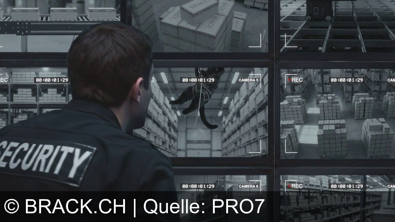 Ein Mann in einer Sicherheitsuniform schaut auf mehrere Überwachungsmonitore. Auf einem Bildschirm ist eine schwarze Katze, die an einem Seil in einem Lager schwingt. Die Monitore zeigen verschiedene Ansichten eines Lagerhauses mit Regalen und gestapelten Kisten.