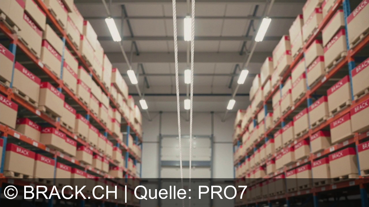 Ein Lager mit hohen Regalen voller Kartons, alles ordentlich gestapelt. Helle Deckenbeleuchtung, zwei Seile hängen von der Decke herab. Kartons mit Aufschrift "BRACK" in Rot. Großer Raum, industrielles Design.