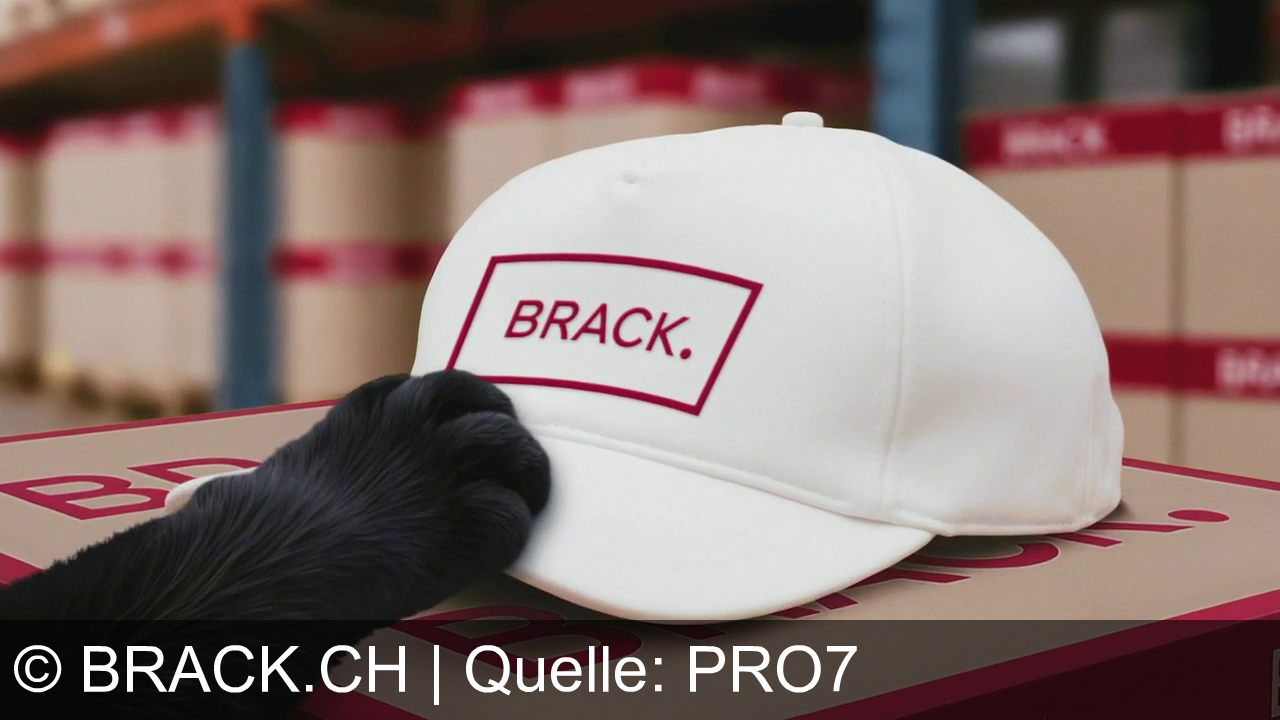 Eine schwarze Pfote hält eine weiße Kappe mit roter Aufschrift "BRACK.". Die Kappe liegt auf einem Karton mit rotem Text. Im Hintergrund sind mehrere gestapelte Kartons in einem Lager zu sehen.