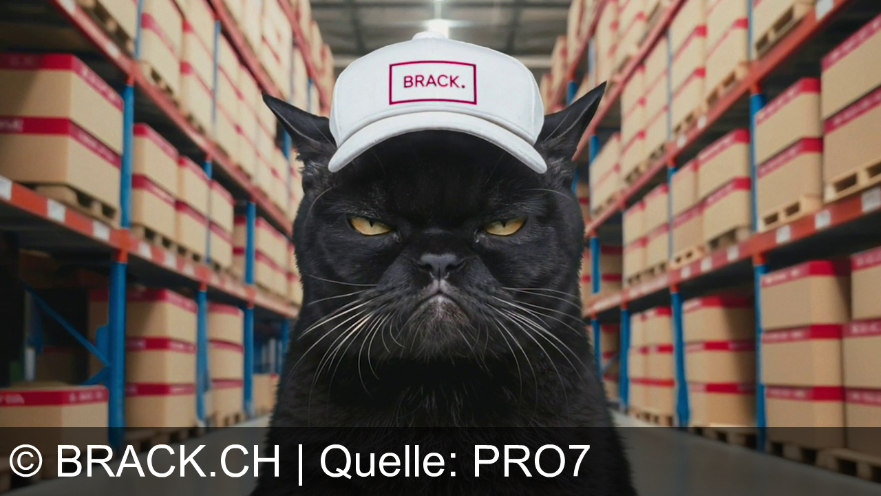 Eine schwarze Katze mit grimmigem Gesichtsausdruck trägt eine weiße Kappe mit der Aufschrift "BRACK." im Vordergrund. Im Hintergrund befinden sich gestapelte Kartons in einem Lager.
