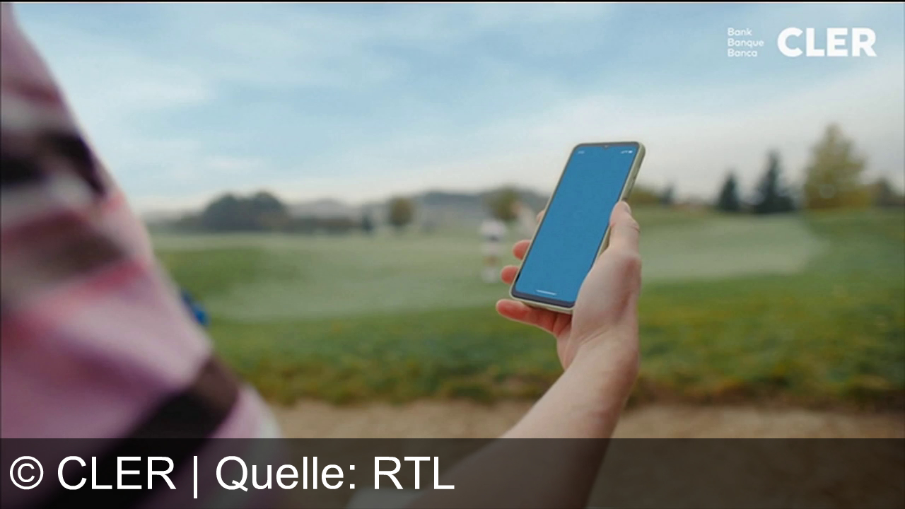 Eine Person hält ein Smartphone in der Hand. Der Bildschirm des Smartphones ist blau. Im Hintergrund ist ein Golfplatz oder eine Wiese zu sehen. Oben rechts steht "Bank Cler".