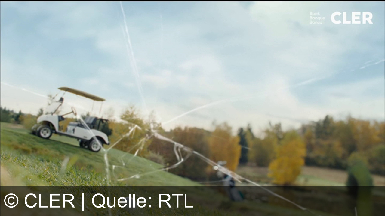 Ein Golfplatz mit einem Golfwagen links und einem Golfball im Vordergrund. Zerbrochenes Glas teilt das Bild. Im Hintergrund bunte Herbstbäume. Oben rechts steht "Bank Cler".