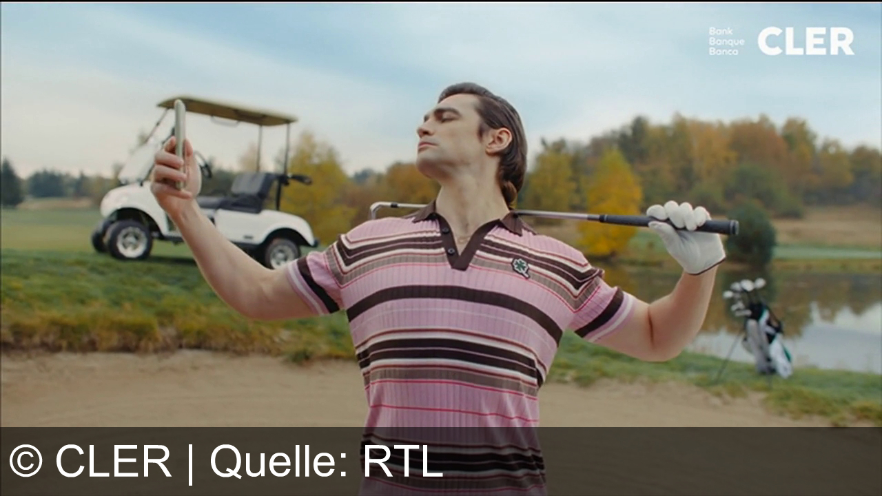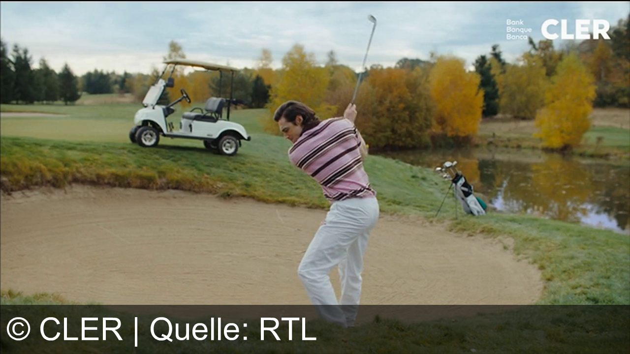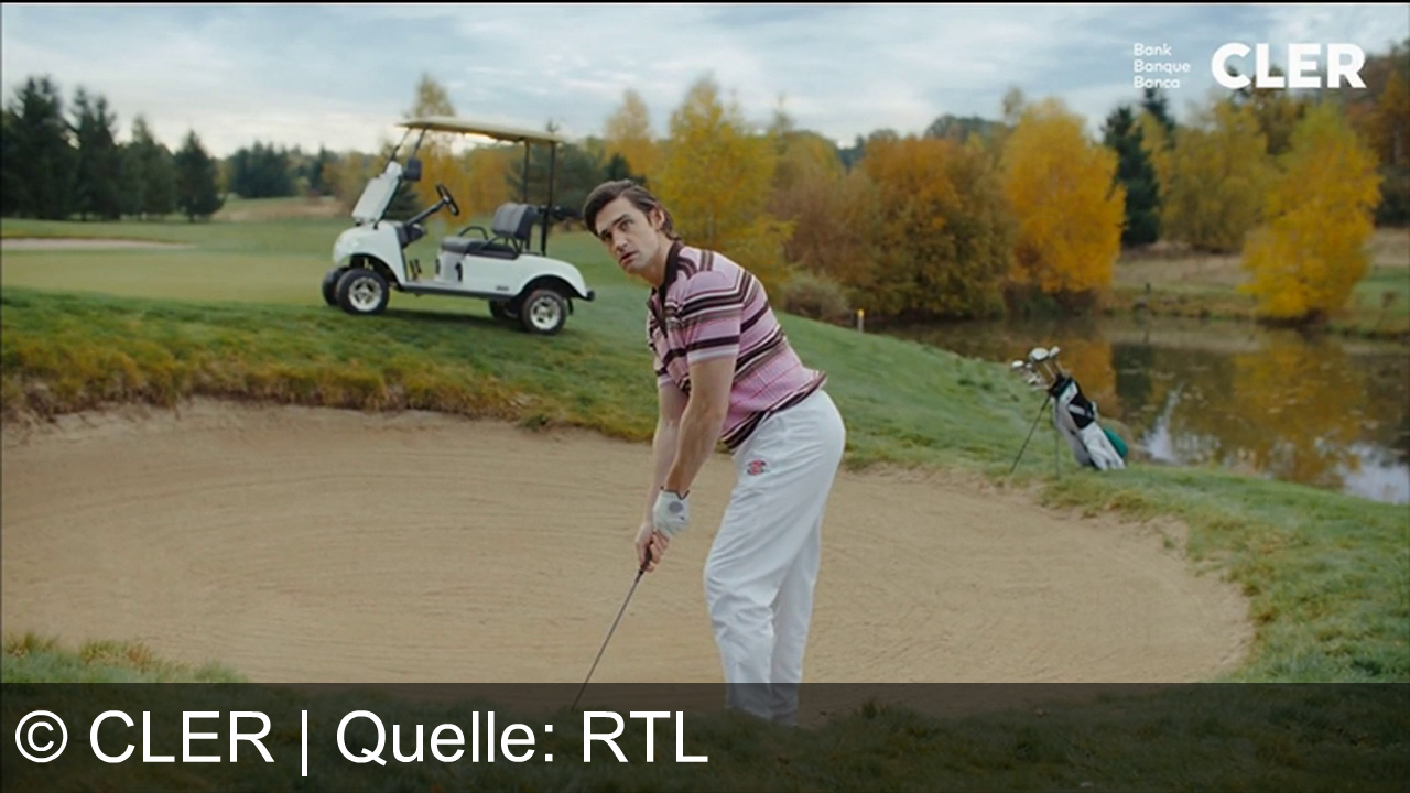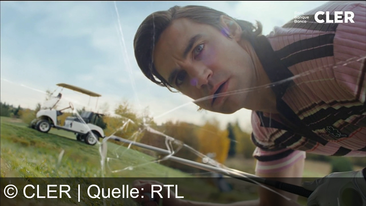 Ein Mann mit gestreiftem Hemd liegt auf dem Boden mit einem Golfball in der Hand. Im Hintergrund steht ein Golfbuggy. Die Szene zeigt einen blauen Himmel und grüne Wiese. Ein gebrochenes Glas ist über dem Gesicht des Mannes. Oben rechts steht "Bank Cler".