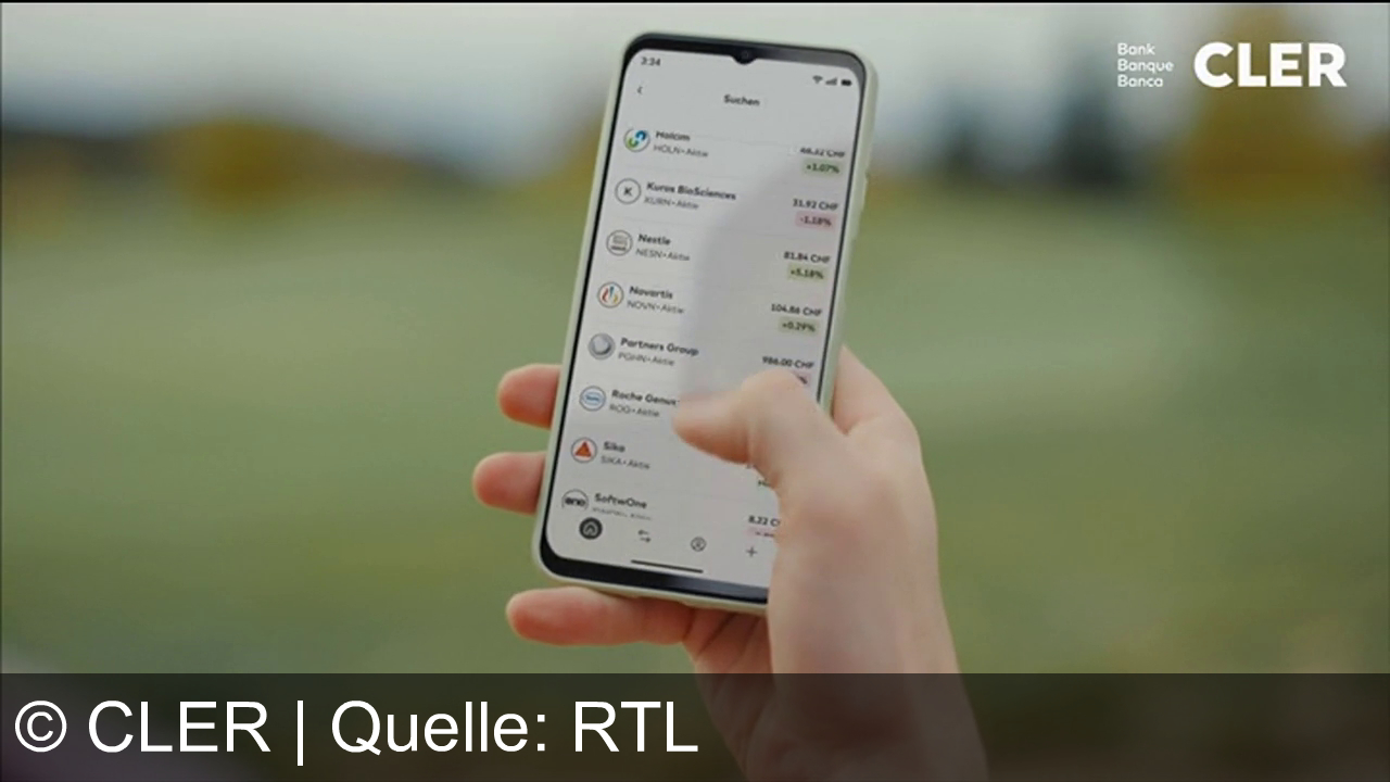 Eine Hand hält ein Smartphone mit einer App, die Aktienkurse anzeigt. Namen wie Holcim, Novartis und Nestlé sind zu sehen, daneben Preise in CHF und Kursveränderungen. Der Hintergrund ist unscharf und grünlich. Oben rechts steht „Bank Banque Banca CLER“.