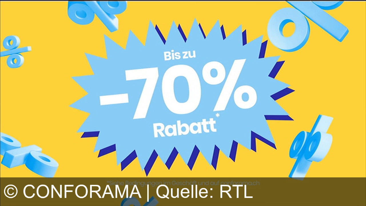 Gelber Hintergrund, blaue Prozentzeichen schweben. In der Mitte ein blaues Stern-Diagramm mit weißem Text: "Bis zu -70% Rabatt". Unten kleiner Text: "Siehe Bedingungen im Geschäft und auf conforama.ch".