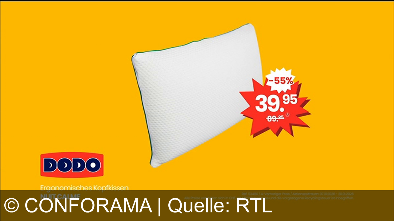 Werbung aus dem Jahr 2026 von Conforama in der Schweiz, mit dem von uns gewählten Titel: "Conforama Super Sale: Ergonomisches Dodo-Kissen & Candy-Waschmaschine bis zu 70% günstiger" mit der Kurzbeschreibung: "Du hast die Wahl: Entdecke den Super Sale bei Conforama – Candy Waschmaschine, Dodo Kissen & mehr, bis zu 70% Rabatt! Wähl bequemer, smarter, schöner. Conforama – was wählst du?". Diese Werbung thematisiert oder beinhaltet die Kategorie/n Kissen, Möbel, Einrichtungshaus, Sofa.