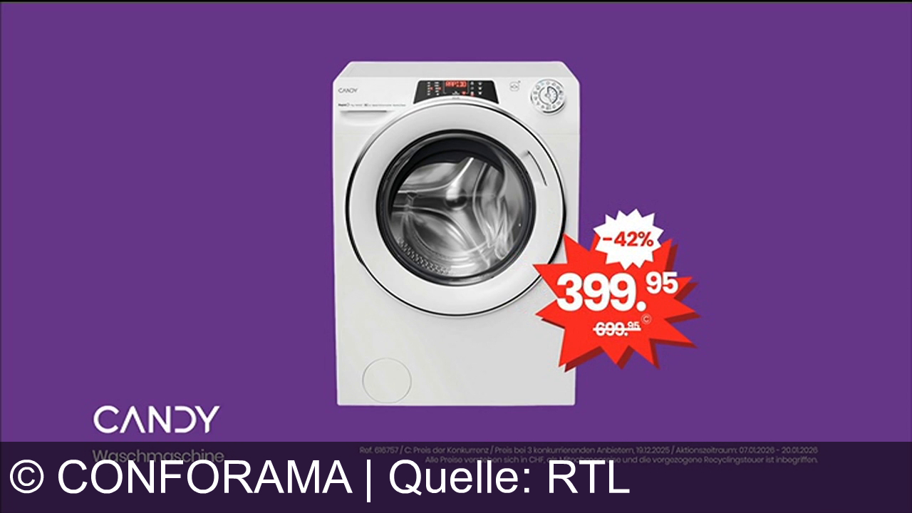 Eine weiĂźe Waschmaschine von "Candy" steht auf lila Hintergrund. Ein rotes Preisschild zeigt "399,95" mit 42% Rabatt. Der ursprĂĽngliche Preis "699,95" ist durchgestrichen. Unten links sind das "Candy"-Logo und "Waschmaschine" zu sehen. Kleinere Textzeilen geben Hinweise zu den Angebotsbedingungen.