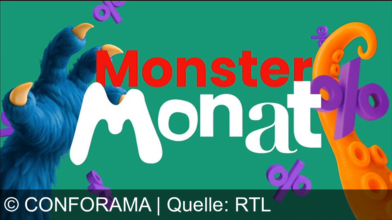 Werbung aus dem Jahr 2025 von Conforama in der Schweiz, mit dem von uns gewählten Titel: "Conforama Monstermonat: 20 % Rabatt auf Möbel & Matratzen, Ecksofa PAUL zum halben Preis" mit der Kurzbeschreibung: "Entdecke den Monstermonat bei Conforama: Wähle monströse Rabatte – 20% auf Möbel & Matratzen! Erschreckend gute Preise warten auf dich. Was wählst du?". Diese Werbung thematisiert oder beinhaltet die Kategorie/n Möbel, Matratzen, Sofa, Einrichtungshaus, Rabatt, Waschmaschine.