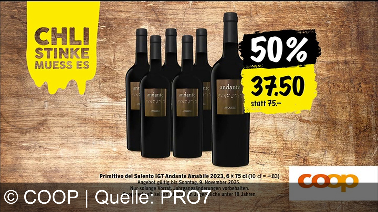 Sechs Weinflaschen "Andante" vor holziger Textur. Links gelber Hintergrund mit Slogan "CHLI STINKE MUESS ES". Rechts Preisreduktion: 50% Rabatt, neu 37.50 statt 75.00. Unten Information zu Angebot, Coop-Logo in Orange. Angebot bis 9. November 2025 gültig. Verkauf nur an Personen ab 18 Jahren.