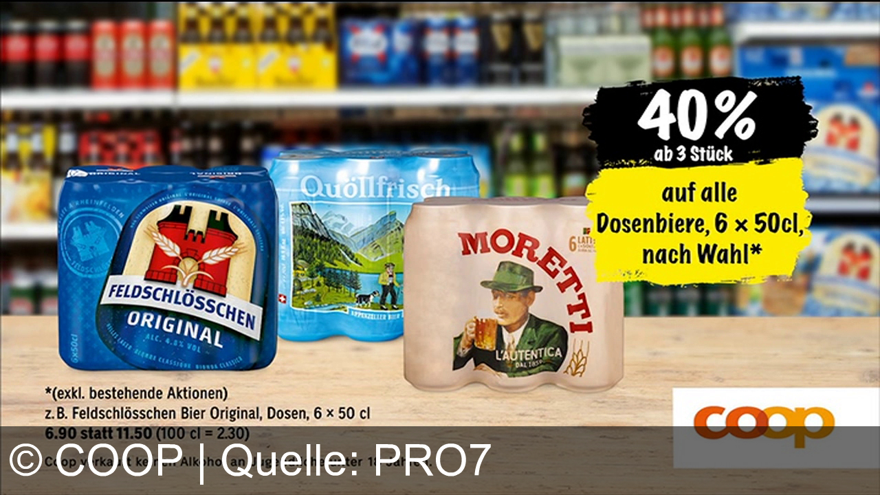 Drei Sechserpacks Bierdosen (Feldschlösschen Original, Quöllfrisch, Moretti) stehen vor einem Supermarktregal. Ein gelbes Schild bewirbt 40% Rabatt ab 3 Stück auf alle Dosenbiere. Unten steht ein Zusatz zu existierenden Aktionen. Rechts unten das Coop-Logo. Hinweis: Kein Alkoholverkauf an Jugendliche unter 18 Jahren.