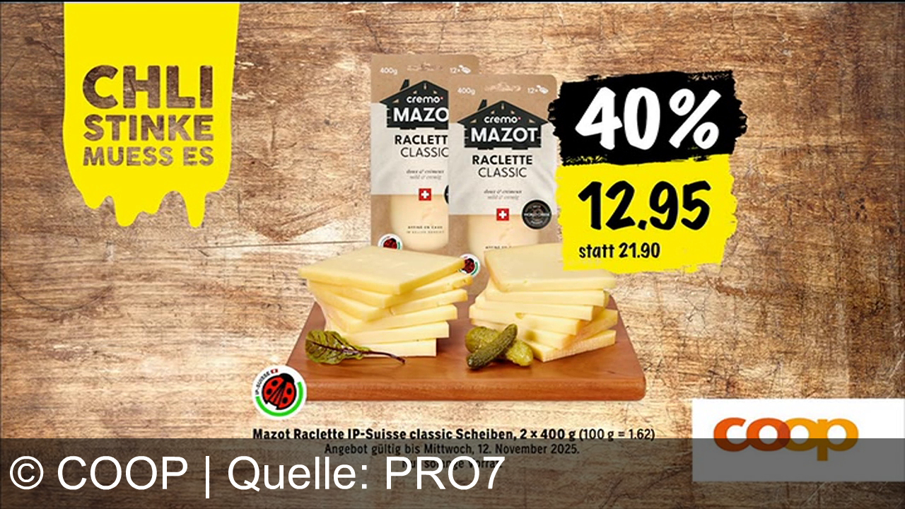 Ein Angebot für Mazot Raclette Classic Käse. Zwei Packungen à 400g auf einem Holzbrett mit Raclette-Scheiben und Gewürzgurken. Große gelbe Schrift links: "Chli stinke muess es". Rabatt von 40%, Preis 12,95 statt 21,90. Gültig bis 12. November 2025 bei Coop. Hintergrund aus Holz.