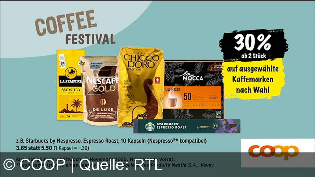 Kaffeefestival mit verschiedenen Kaffeemarken wie La Semeuse, Nescafé Gold, Chicco D’Oro, La Mocca und Starbucks. Rabatt von 30% ab 2 Stück auf ausgewählte Marken. Gültig bis 5. November 2025. Angebot bei Coop. Preise und Kompatibilität für Nespresso-Kapseln werden erwähnt.