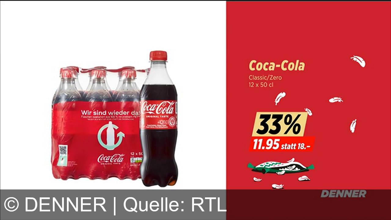 Links ist ein Paket mit zwölf Coca-Cola-Flaschen zu sehen, daneben eine einzelne Flasche. Rechts steht "Coca-Cola Classic/Zero 12 x 50 cl" mit einem Rabatt von 33 %, der Preis ist 11,95 statt 18 CHF. Ganz unten rechts ist das Denner-Logo abgebildet.