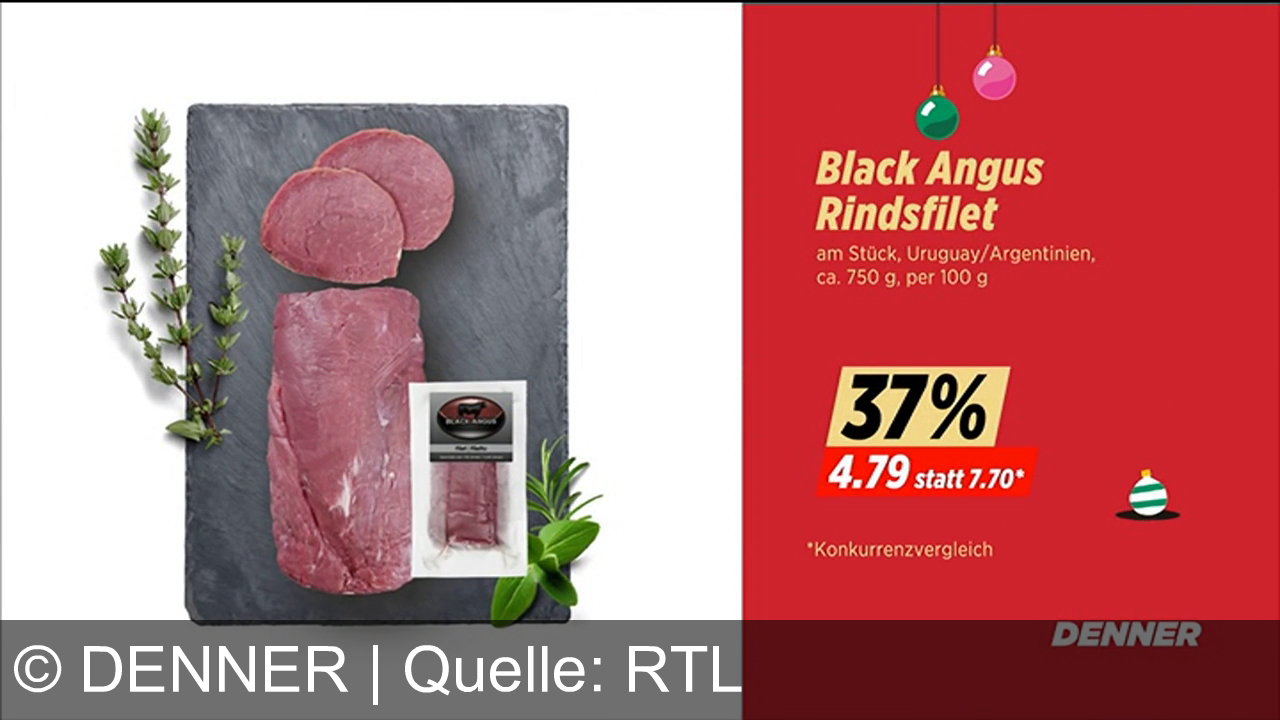 Auf einer schwarzen Schieferplatte liegen Black Angus Rindsfilets, daneben Kräuter. Rechts auf rotem Hintergrund: Preisreduktion um 37%, neuer Preis 4.79 statt 7.70. Herkunft Uruguay/Argentinien, ca. 750 g. Oben hängen zwei bunte Weihnachtskugeln. Unten rechts das Logo von Denner.