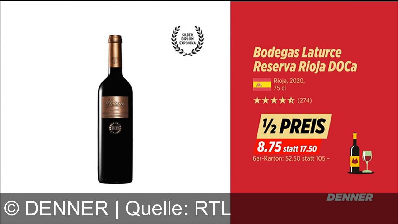 Eine Weinflasche mit braunem Etikett links. Rechts auf rotem Hintergrund: "Bodegas Laturce Reserva Rioja DOCa", Spanien-Flagge, Jahrgang 2020, 75 cl. Fünf-Sterne-Bewertung mit 274 Bewertungen. "½ Preis", neuer Preis 8.75 statt 17.50, 6er-Karton für 52.50 statt 105. Denner-Logo unten, Weinflasche und Glas als Icon.