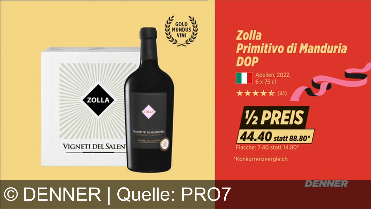 Eine Weinflasche „Zolla Primitivo di Manduria DOP“ steht vor einem Karton. Links oben ein „Gold Mundus Vini“-Abzeichen. Rechts der Text: Herkunft Apulien, Jahrgang 2022, 6 x 75 cl. Fünf Sterne und `41` daneben. Groß: "½ PREIS 44.40 statt 88.80". Darunter „Denner“ und eine pink-schwarze Schleife. Flaschenpreis „7.40 statt 14.80“ und Hinweis auf Preisvergleich.