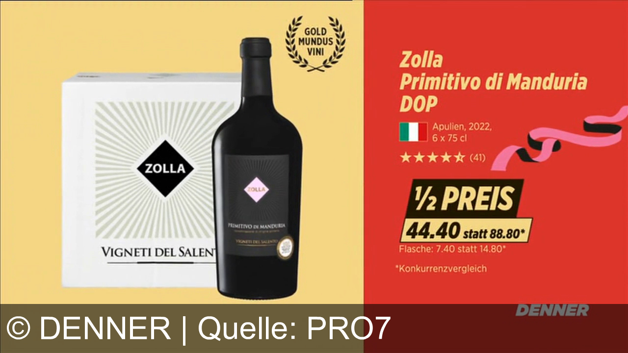 Eine Weinflasche und eine Box, beide mit "Zolla" beschriftet. Links ein gelber Hintergrund, rechts ein roter. "Zolla Primitivo di Manduria DOP" mit italienischer Flagge, Jahrgang 2022. Preisreduktion auf 44.40 statt 88.80 für sechs Flaschen à 75 cl. Gold Mundus Vini Auszeichnung. Text: "Denner" unten rechts. Star-Bewertung mit 41 Bewertungen.