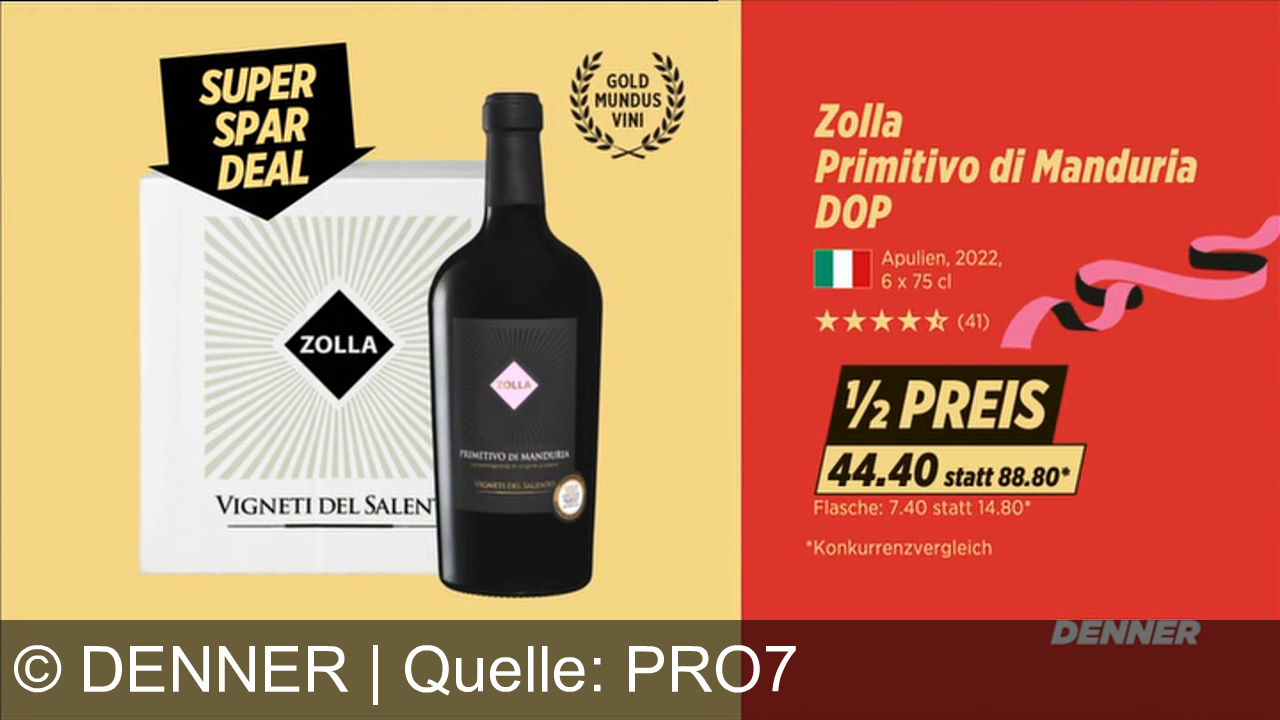 "Super Spar Deal" für Zolla Primitivo di Manduria DOP. Goldene Mundus Vini Auszeichnung. Flasche im Vordergrund, daneben Verpackung. Herkunft: Apulien, 2022, 6 x 75 cl. Preis: 44.40 statt 88.80, Flaschenpreis 7.40 statt 14.80. Hintergrund gelb und rot. Bewertungen 4 Sterne von 41 Bewertungen, Marke Denner.