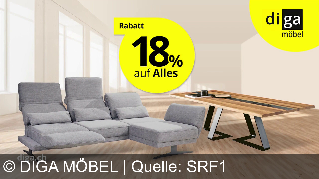 Graues Sofa und großer Holztisch stehen in einem hellen Raum. Ein gelber Kreis wirbt mit 18 Prozent Rabatt auf alles. Unten steht die Webadresse diga.ch.