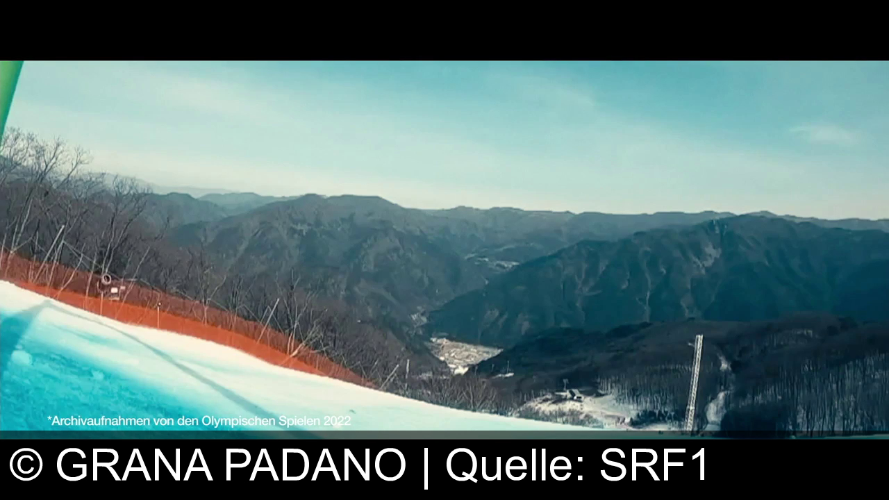 Eine schneebedeckte Skipiste mit einem orangefarbenen Fangnetz am Rand. Im Hintergrund eine Berglandschaft mit klarblauem Himmel. Unten links steht ein Text: "*Archivaufnahmen von den Olympischen Spielen 2022".