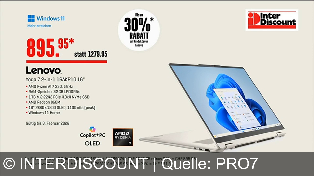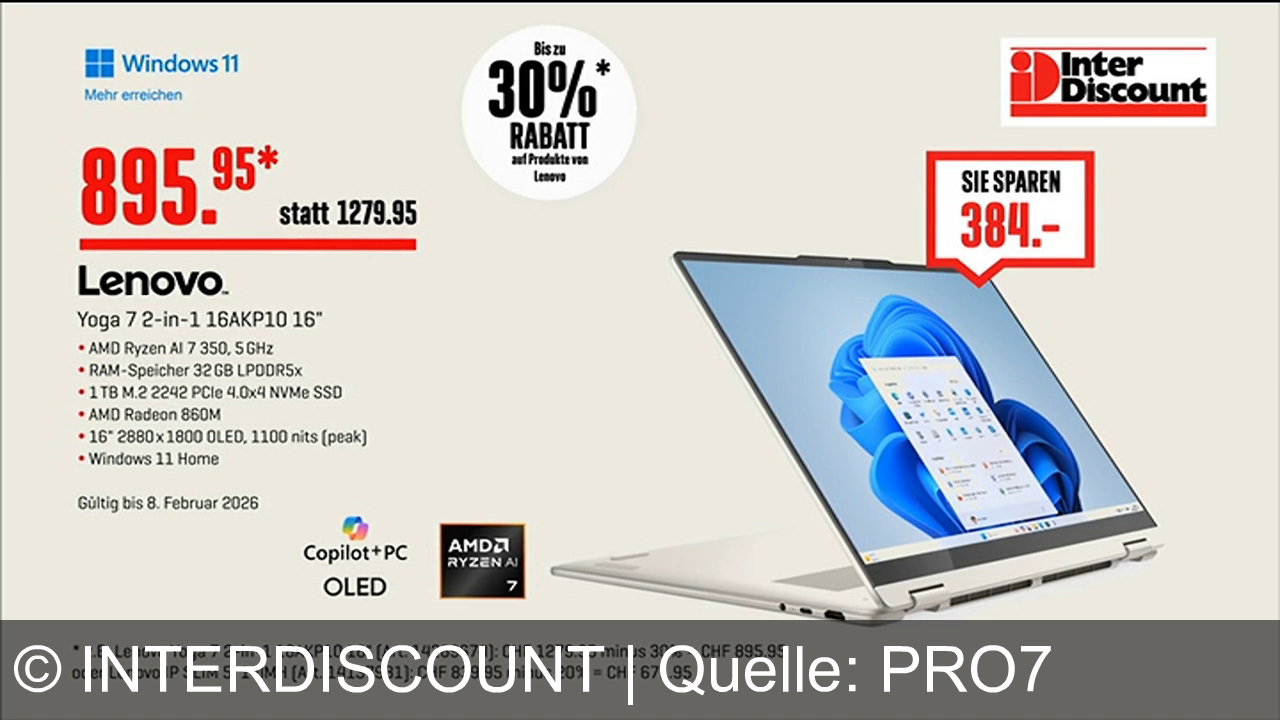 Lenovo Yoga 7 2-in-1 16" fĂĽr 895,95 CHF statt 1279,95 CHF. Technische Daten: AMD Ryzen AI 7 350, 32 GB RAM, 1 TB SSD, AMD Radeon 860M, 16" OLED-Display. Windows 11 Home. Angebot bis 8. Februar 2026. Bis zu 30% Rabatt auf Lenovo-Produkte. Logo von Interdiscount oben rechts.