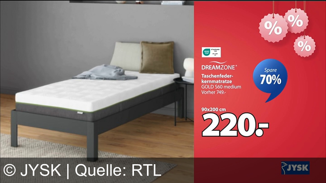 Links ein Bett mit Matratze und zwei Kissen, rechts eine rote Werbefläche. Text: Dreamzone Taschenfederkernmatratze, 90x200 cm, vorher 749, jetzt 220 Euro. 70% Rabatt, mit Jysk-Logo. Prozentzeichen als Dekoration oben. Matratze ist Oeko-Tex Standard 100 zertifiziert. Boden aus Holz, Teppich darunter.