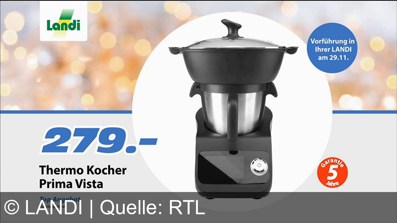 Im Bild ist ein Thermokocher "Prima Vista" für 279.- zu sehen. Oben links steht das Logo von Landi. Rechts im Bild ist ein Kreis mit dem Text "Vorführung in Ihrer LANDI am 29.11.". Unten rechts befindet sich ein roter Kreis mit "Garantie 5 Jahre". Darunter steht "Top Angebot, nur solange Vorrat". Der Hintergrund zeigt unscharfe Lichter.