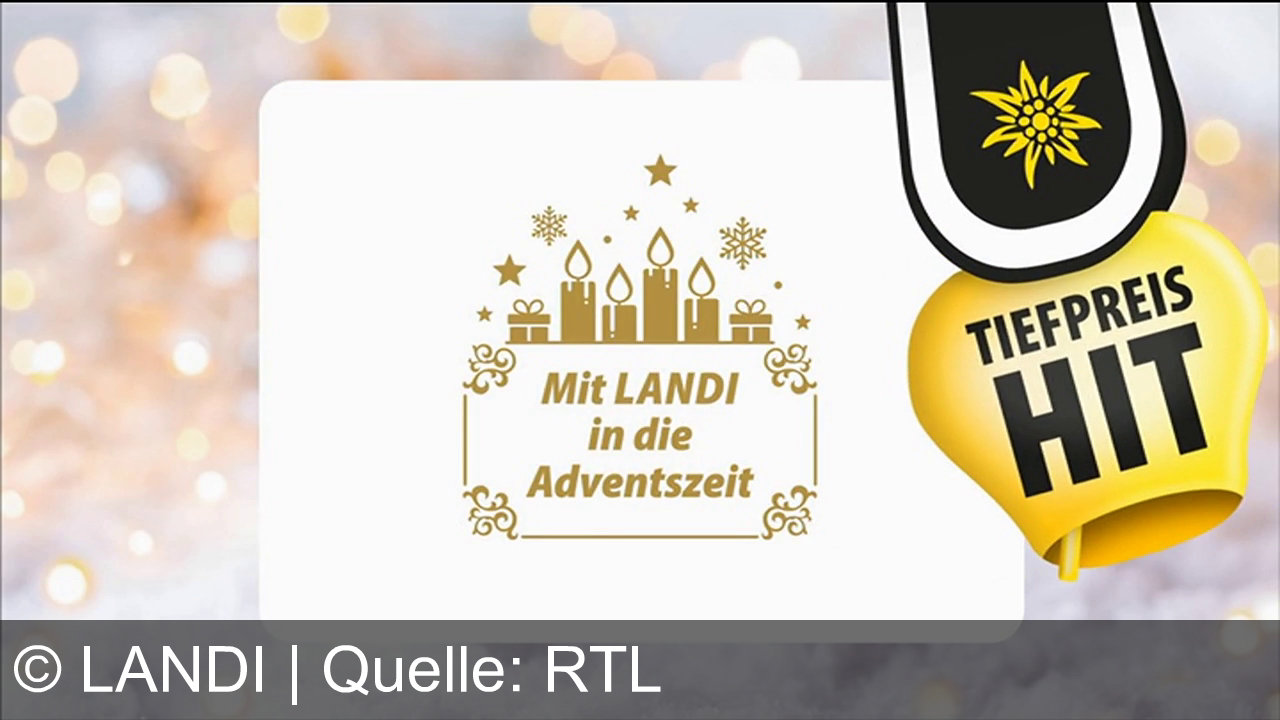 Ein Werbebild mit goldenen Kerzen, Sternen und Schneeflocken, daneben ein gelbes Schild mit "TIEFPREIS HIT". Text: "Mit LANDI in die Adventszeit". Hintergrund verschwommen und festlich.