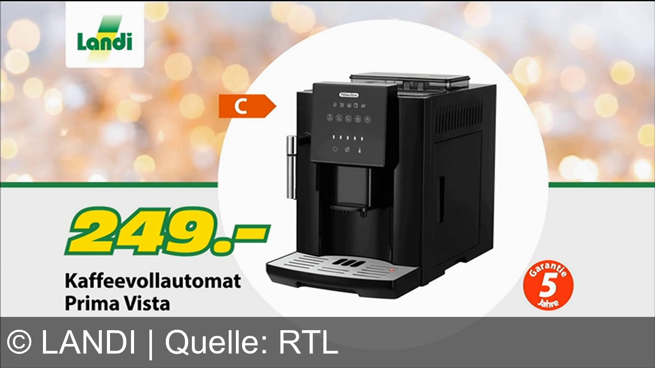 Ein schwarzer Kaffeevollautomat mit digitalem Display, Preis von 249.-, Marke Landi oben links, "Garantie 5 Jahre" in rotem Kreis unten rechts. Hintergrund verläuft verschwommen in warmen Tönen. Text: Kaffevollautomat Prima Vista. Ein "C" in orangefarbener Box links von der Maschine.