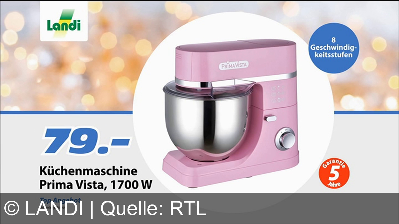 Das Bild zeigt eine rosa Küchenmaschine "Prima Vista" mit 1700 W. Preis: 79 €. Es gibt 8 Geschwindigkeitsstufen und eine 5-Jahres-Garantie. Oben links ist das Logo von Landi, unten steht "Top Angebot" mit dem Hinweis "Nur solange Vorrat". Der Hintergrund hat ein unscharfes Bokeh-Muster in Orange- und Weißtönen.