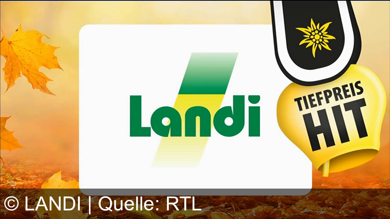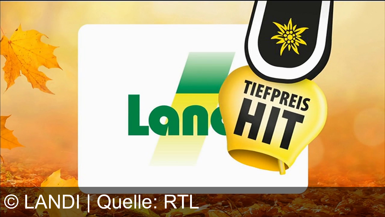 Ein Logo von Landi ist mittig auf einem weißen Hintergrund. Rechts daneben ist ein gelbes Schild mit der Aufschrift "TIEFSTPREIS HIT". Oben hängt ein Abzeichen mit einem Edelweiß. Der Hintergrund ist herbstlich mit bunten Blättern.